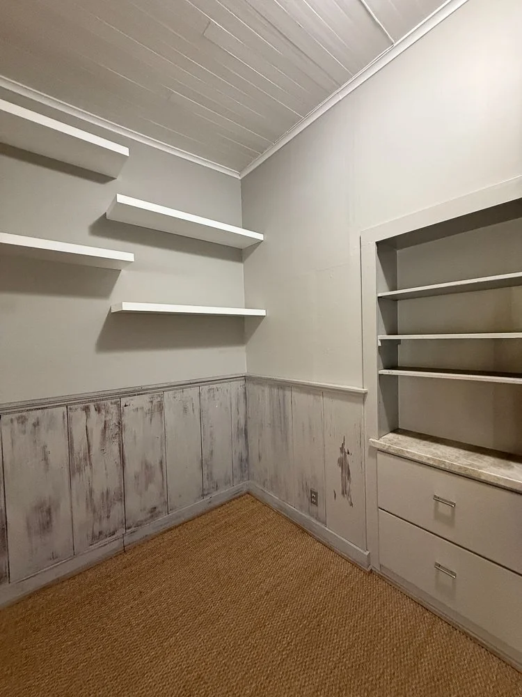 The covered entry porch has an old-west vibe with a bulletin board, vintage door, and boardwalk-style raised deck for inviting curb appeal. Inside, the open layout offers lots of design options with vaulted ceilings, built-in shelving, a unique artisan barn-door storage area, small private bathroom (toilet/sink), side windows, built in lighting, and radiant heat.