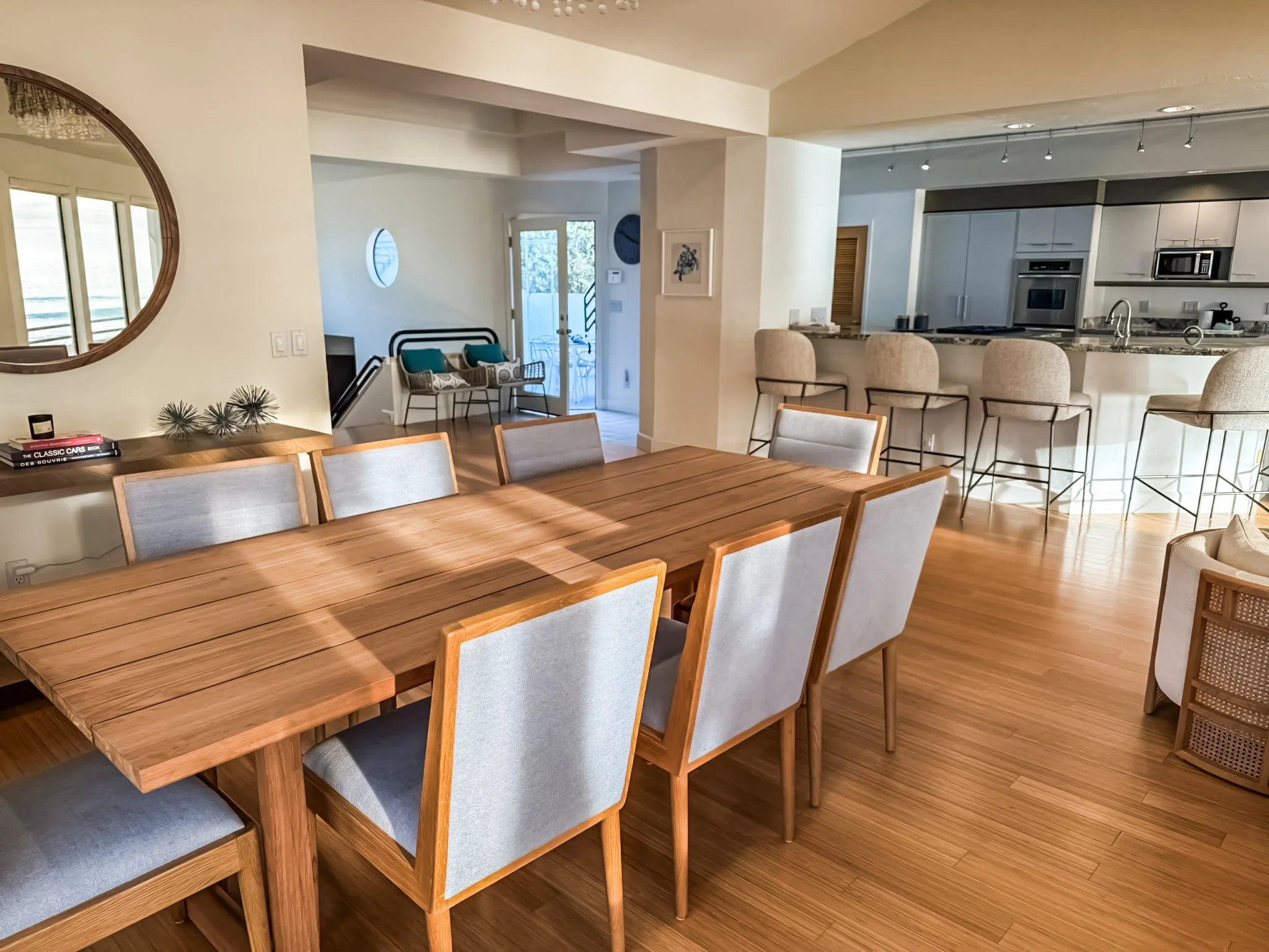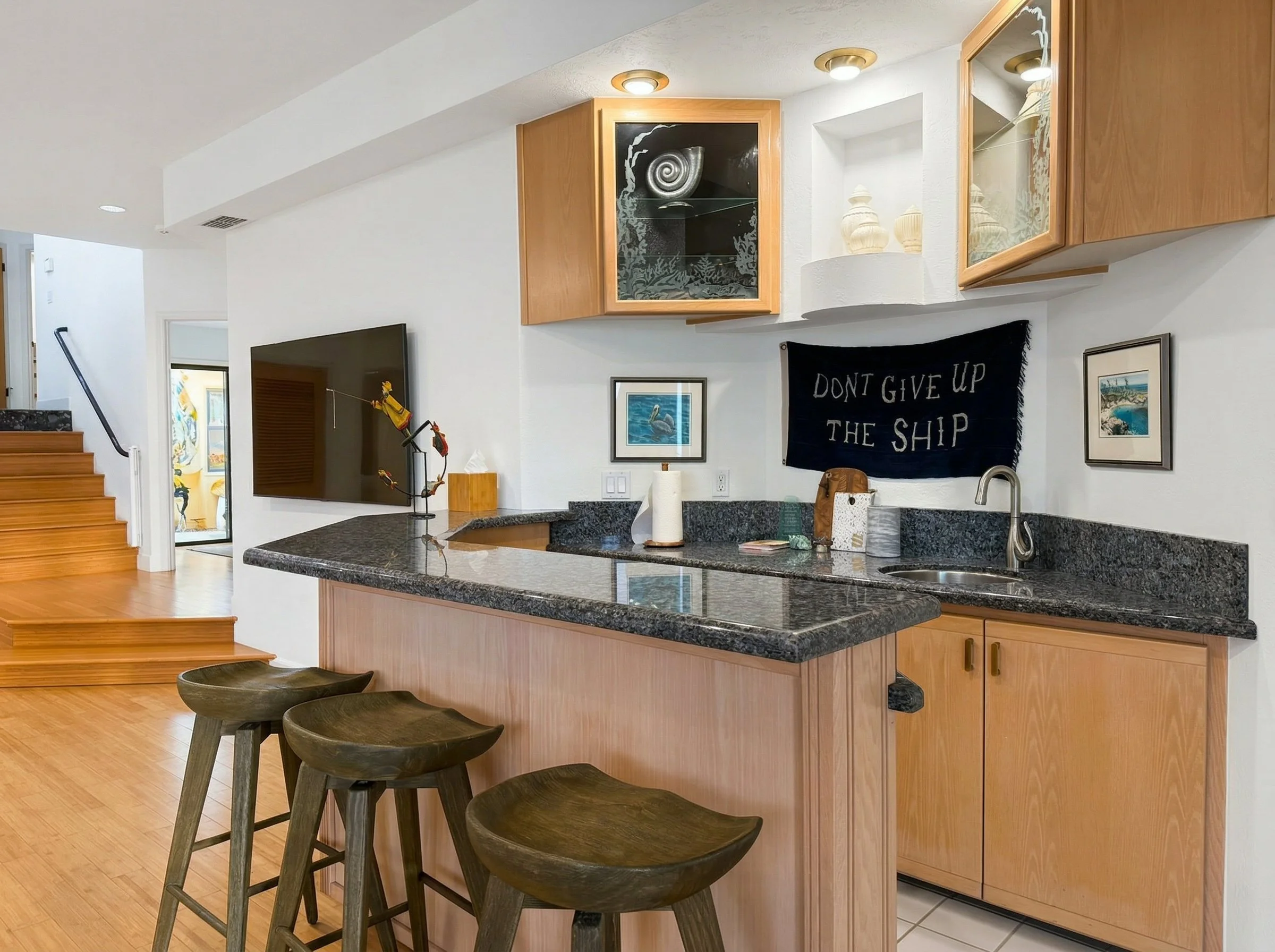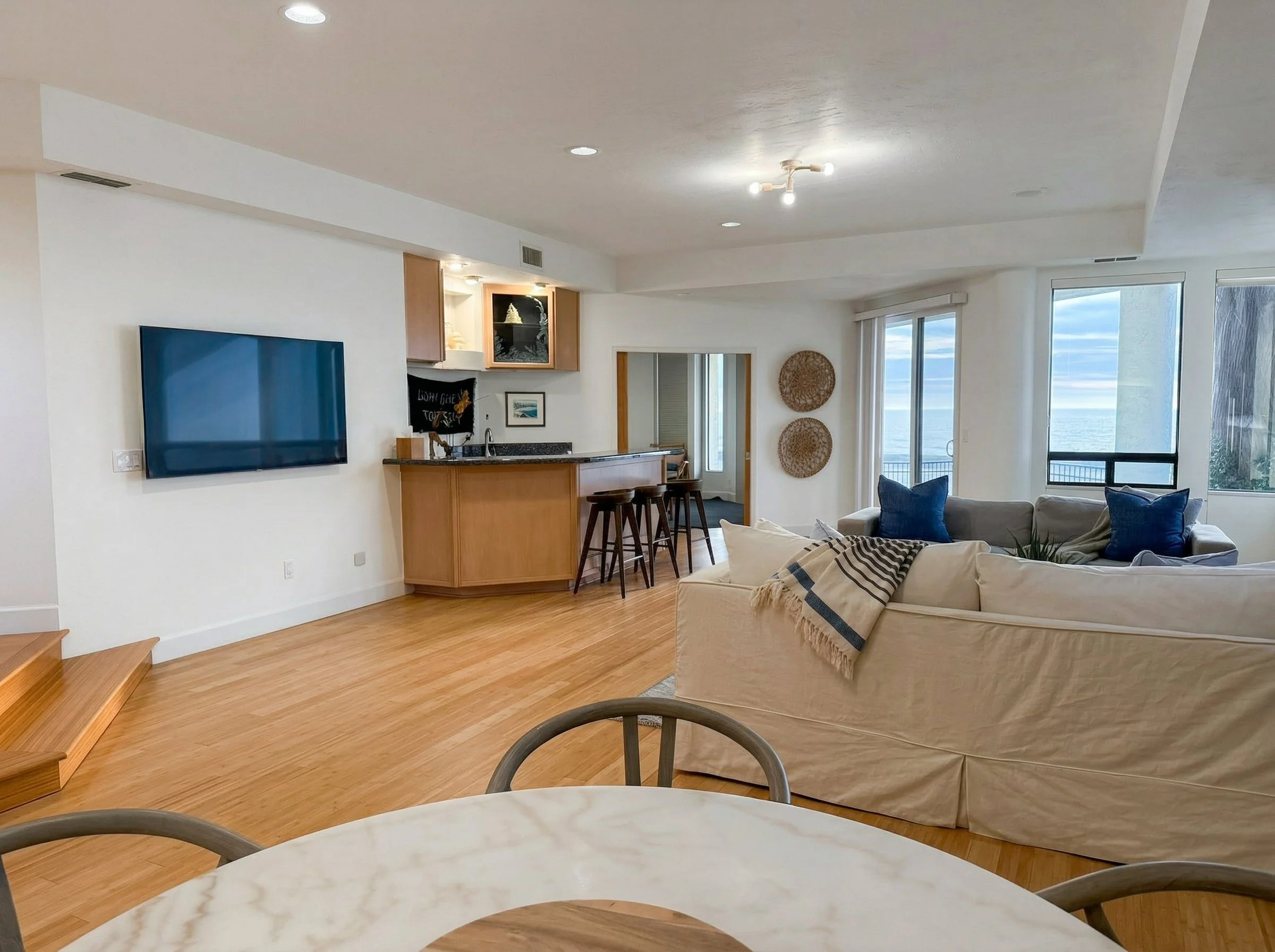Upstairs level features expansive living room, custom bar seating, and dining spaces, all with ocean views