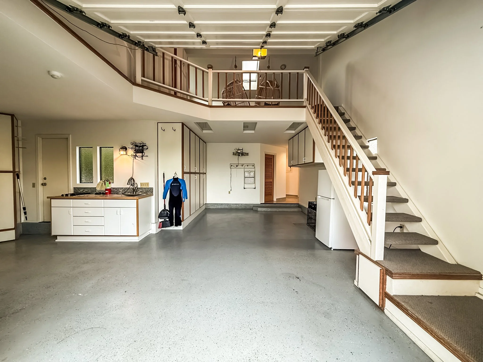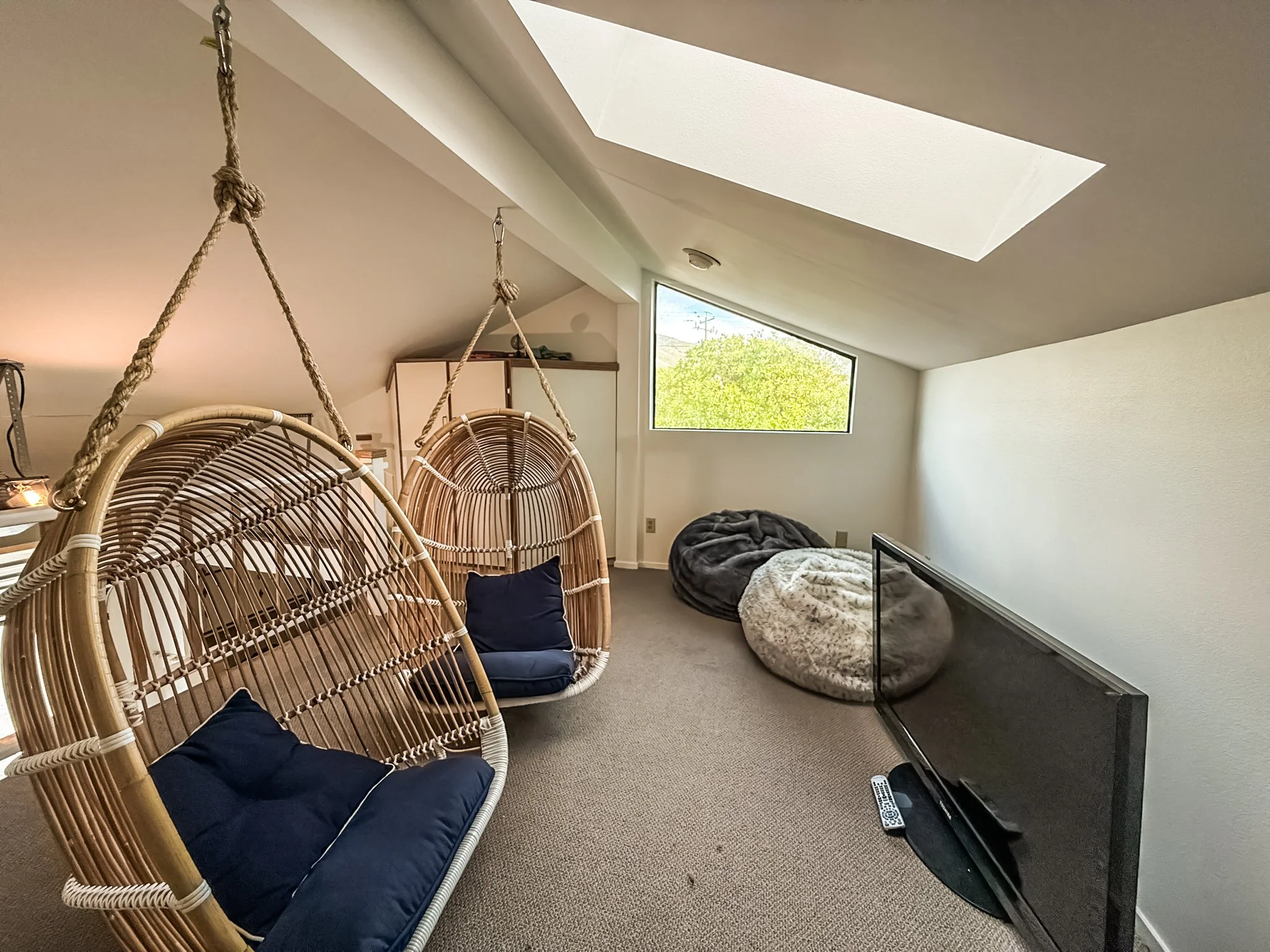 Funky and fun bonus loft with swinging chairs, bean bag chairs, and TV