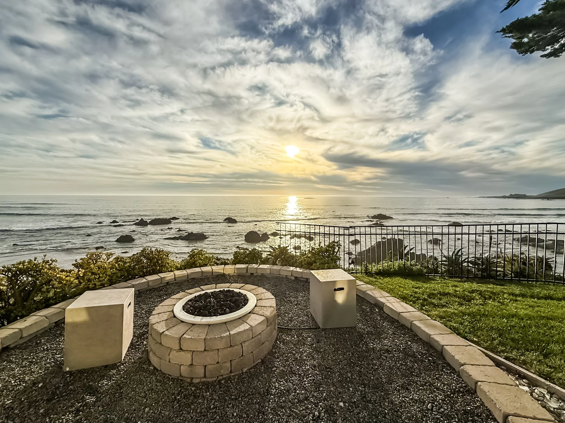 Fire pit and private lawn on the outdoor veranda for unobstructed sunsets. Dine outdoors or just relax in the sun.
