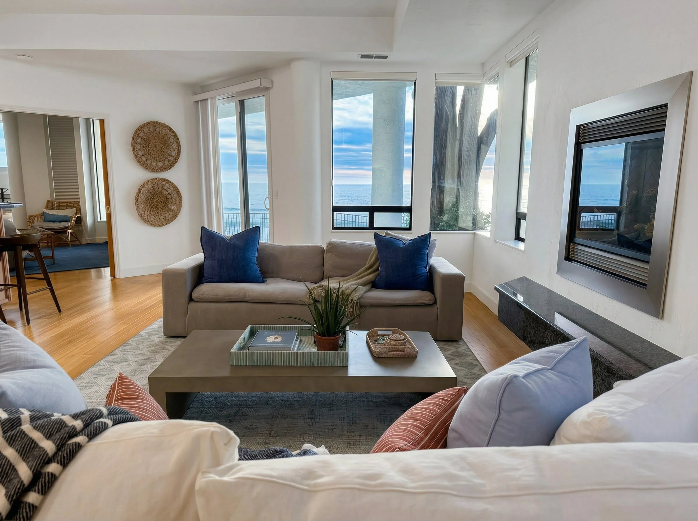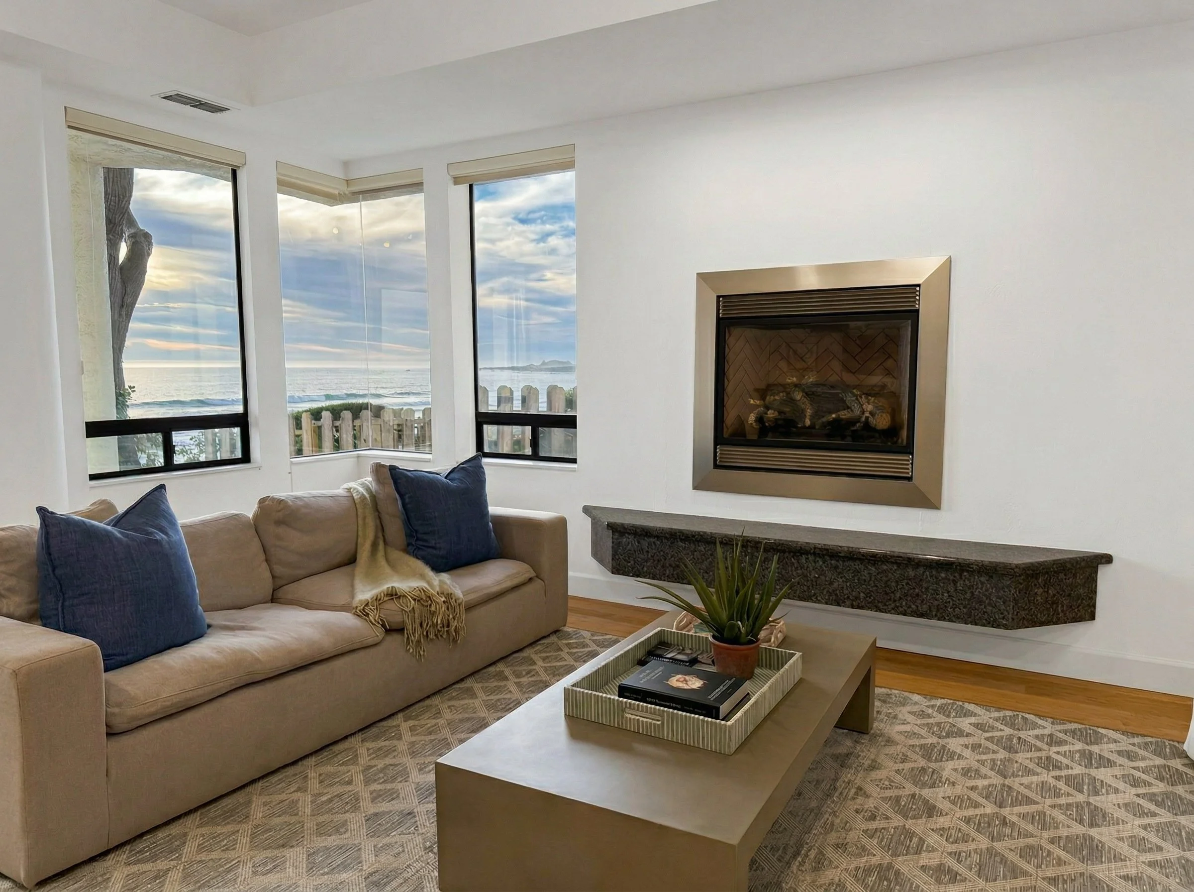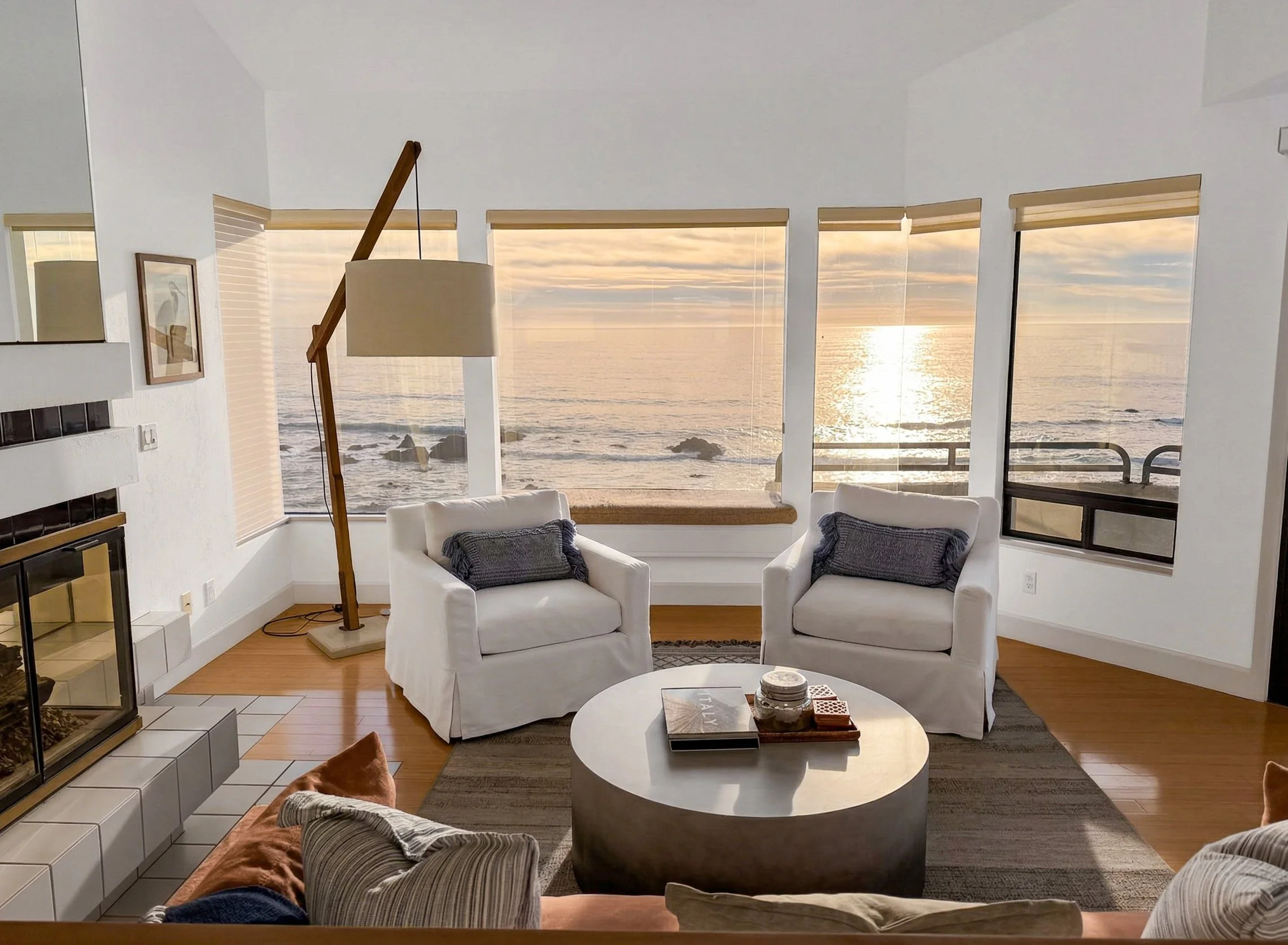 Extra custom seating areas plus full-sized dining table, cozy living room with fireplace, and ocean-facing window seat