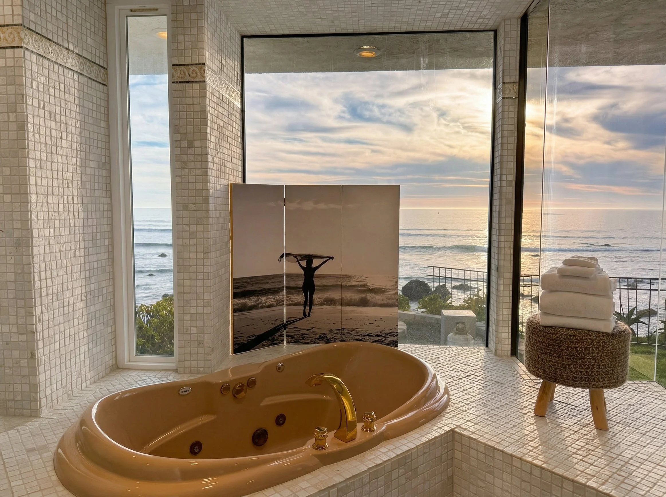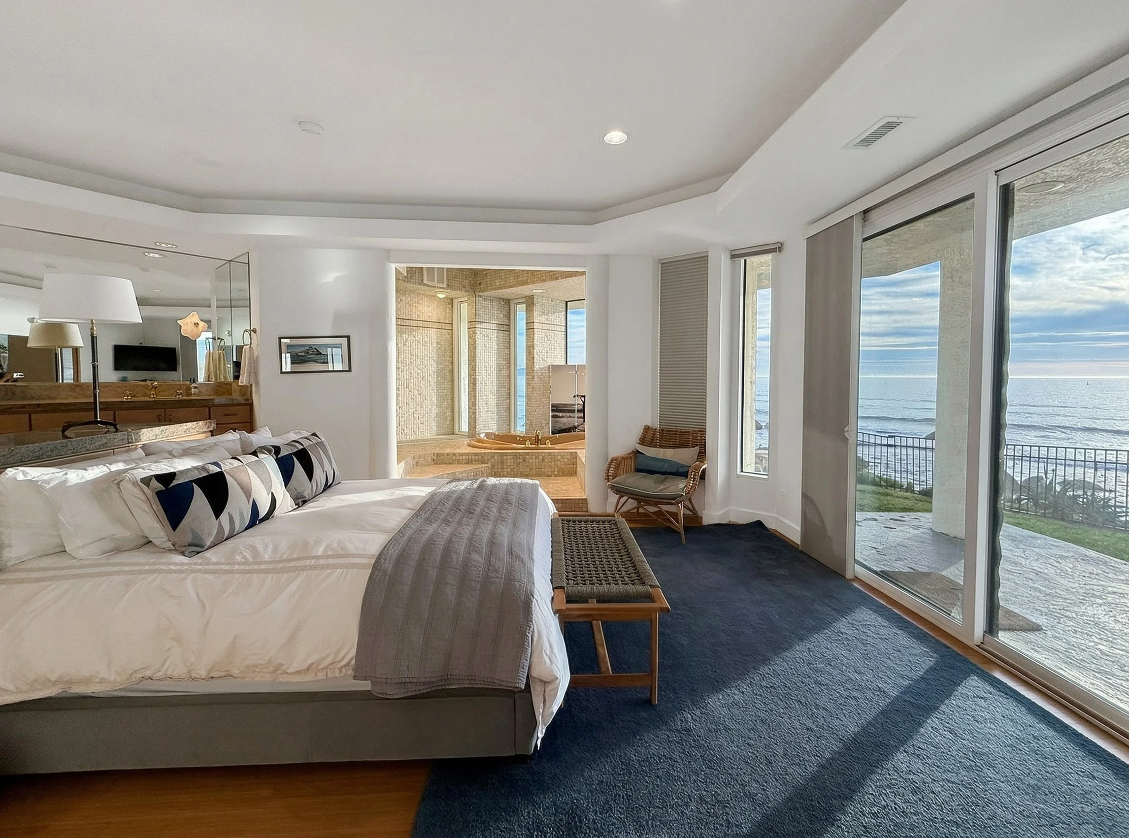 Primary suite is its own spa-like retreat; wrap around vanity area, private washroom, huge walk-in-closet, and soaker tub facing the ocean